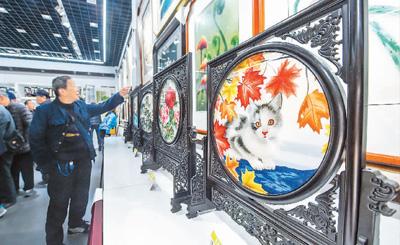 图为游客在苏州市高新区苏绣小镇参观选购苏绣产品。 新华社记者 李 博摄 |