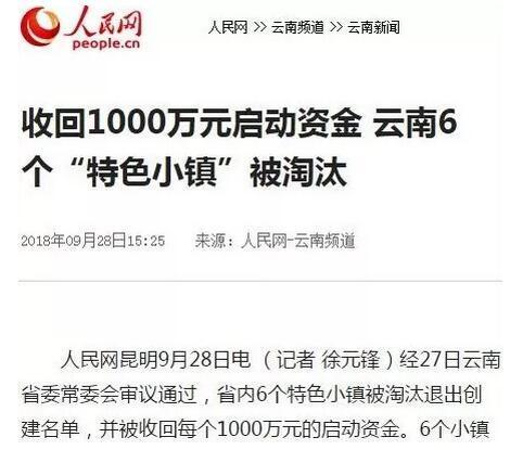 据9月28日人民网消息,经27日云南省委常委会审议通过,省内6个特色小镇被淘汰退出创建名单,并被收回每个1000万元的启动资金。这6个小镇是:鸡足山禅修小镇、八宝壮乡小镇、永胜清水古镇、陆良蚕桑小镇、罗平油菜花小镇、个旧大屯特色制造小镇。