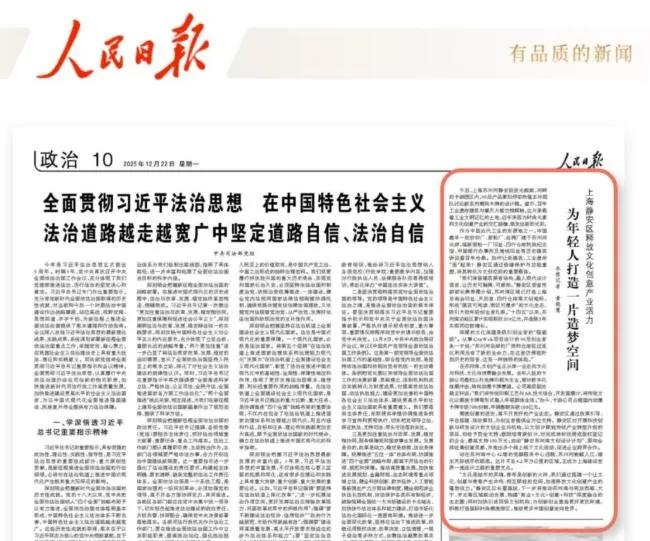 另一方面,《人民日报》亦深入到产业一线,在12月22日《上海静安区释放文化创意产业活力 为年轻人打造一片造梦空间》的报道中,记者深入上海苏河湾的卡游园区,描绘了这样一幅场景:00后产品策划师在由百年工业遗存改造的空间里,讨论着新系列潮玩卡牌的设计,这片承载历史记忆的土地,因文创产业的注入而焕发新生,成为年轻人追逐梦想的舞台。